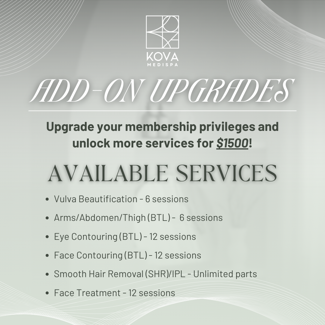 Upgrade your membership by topping up $1,500 per service to enjoy exclusive access to the following premium treatments at special member rates:
